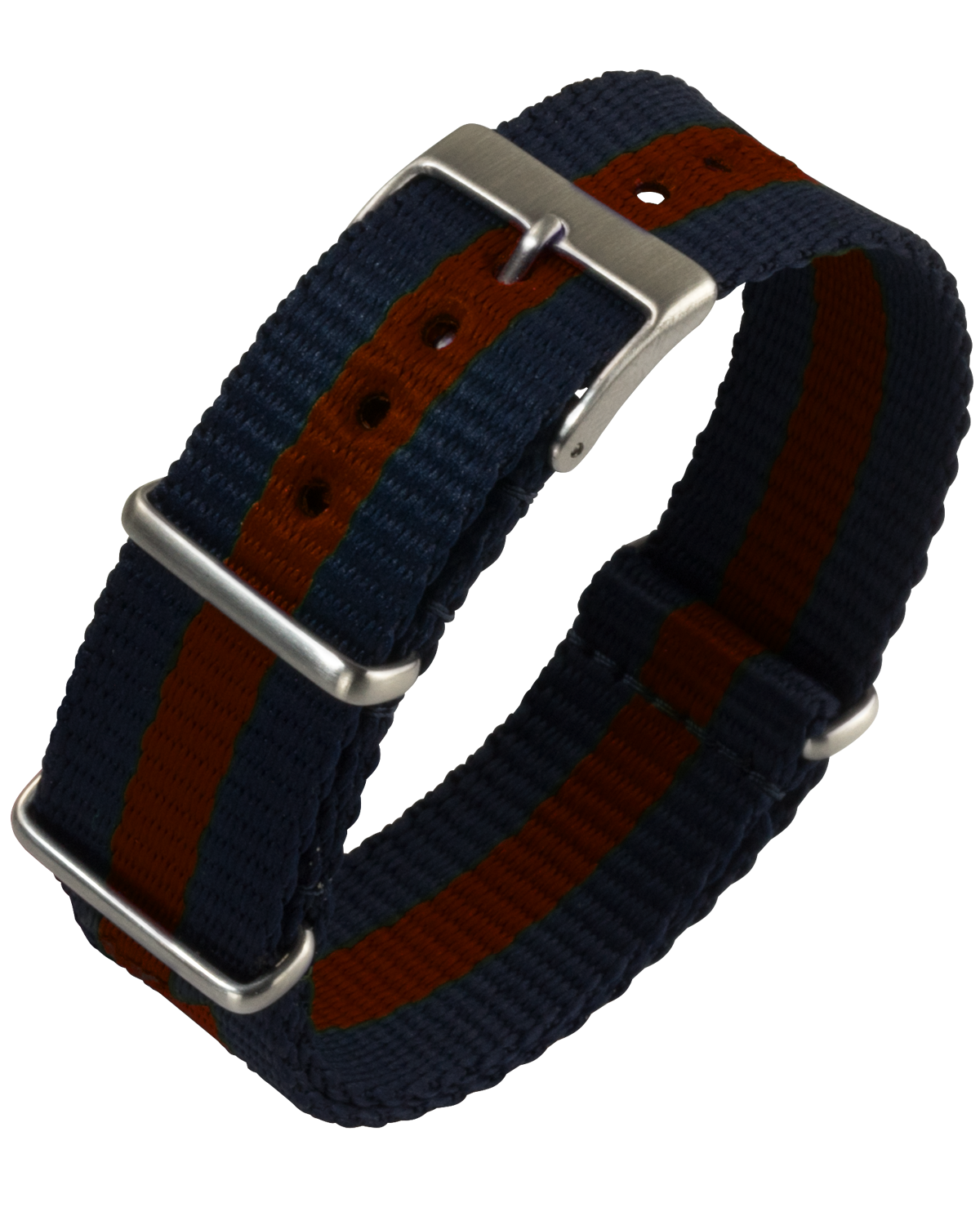 Gewobenes Nylon-Band im beliebten Nato-Style. Breite 20 mm. Alle Ränder und Dornlöcher werden speziell versiegelt um Ausfransen zu verhindern. Die robusten Edelstahl-Schlaufen und die Schließe sind fest im Band eingenäht. Ein stabiles, langlebiges und hochwertig verarbeitetes Uhrenarmband.