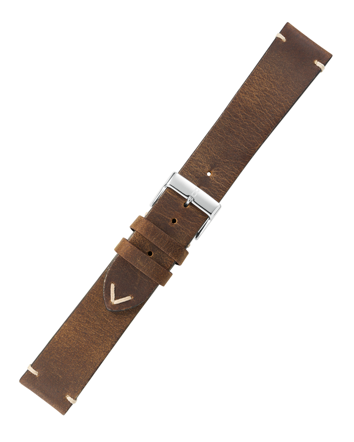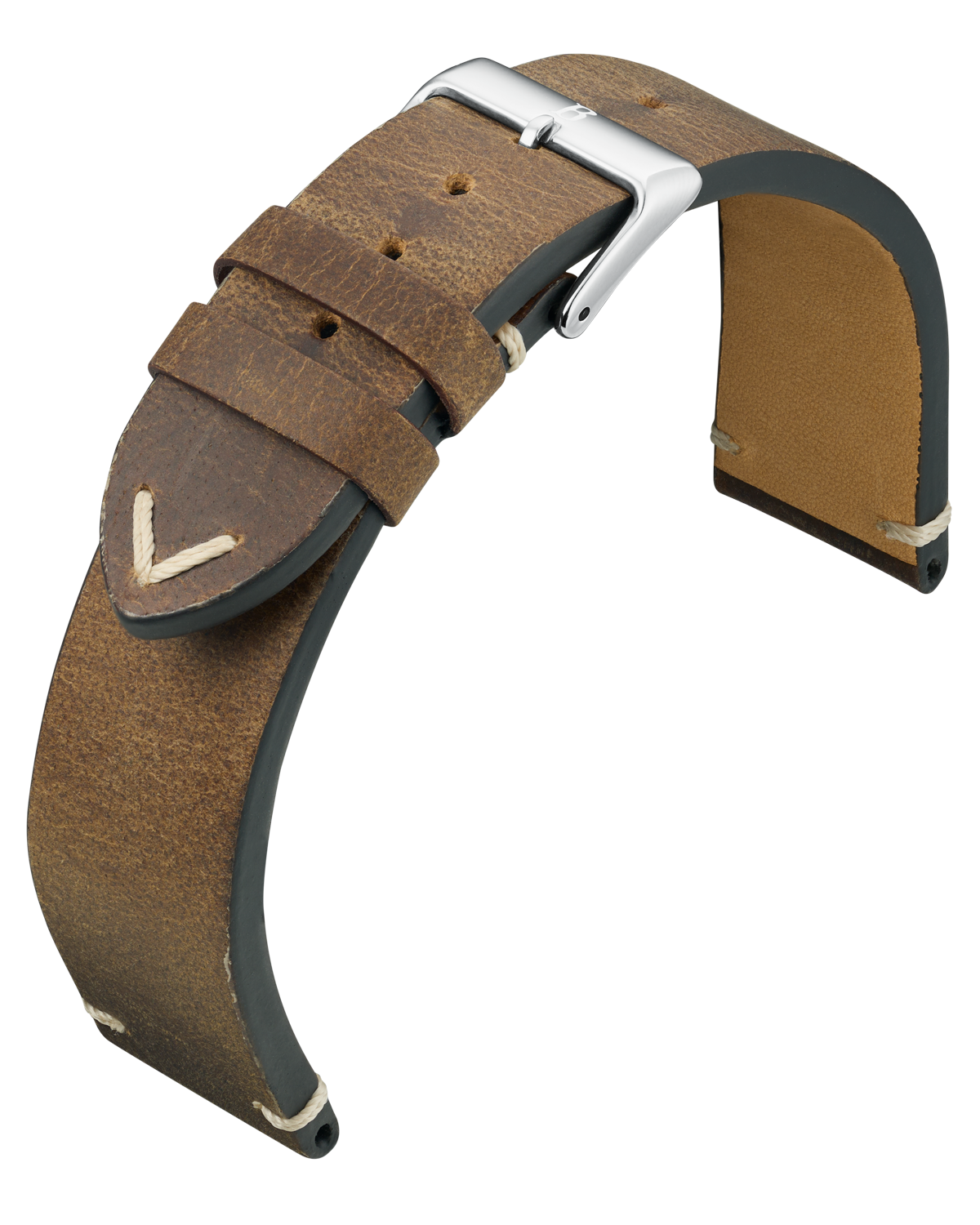 Uhrarmband im Vintage Stil aus geöltem Rindleder, mit naturweißer Handnaht an den Enden und an der Spitze. Hautfreundliches Futterleder, Edelstahl-Dornschließe.