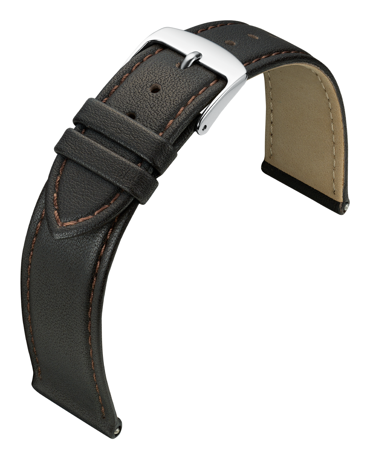 Klassisches Uhrarmband aus besonders weichem Kalbleder. Ungepolsterte Ausführung, rembordierte Kanten, hautfreundliches Nubuk-Futterleder und Edelstahl-Dornschließe.