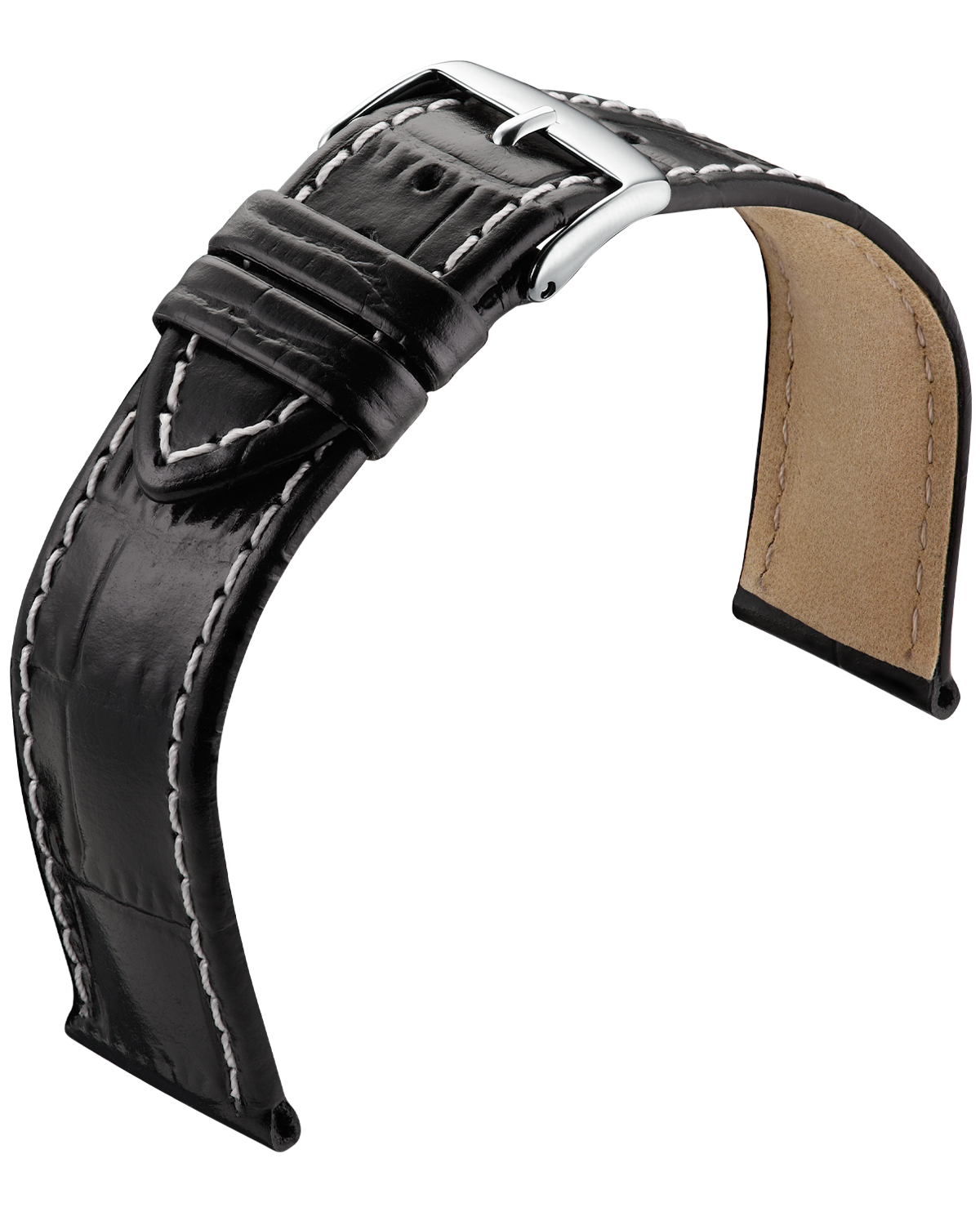 Hochwertiges Kalbleder-Uhrarmband mit Louisiana-Kroko-Prägung und weißer Kontrastnaht.