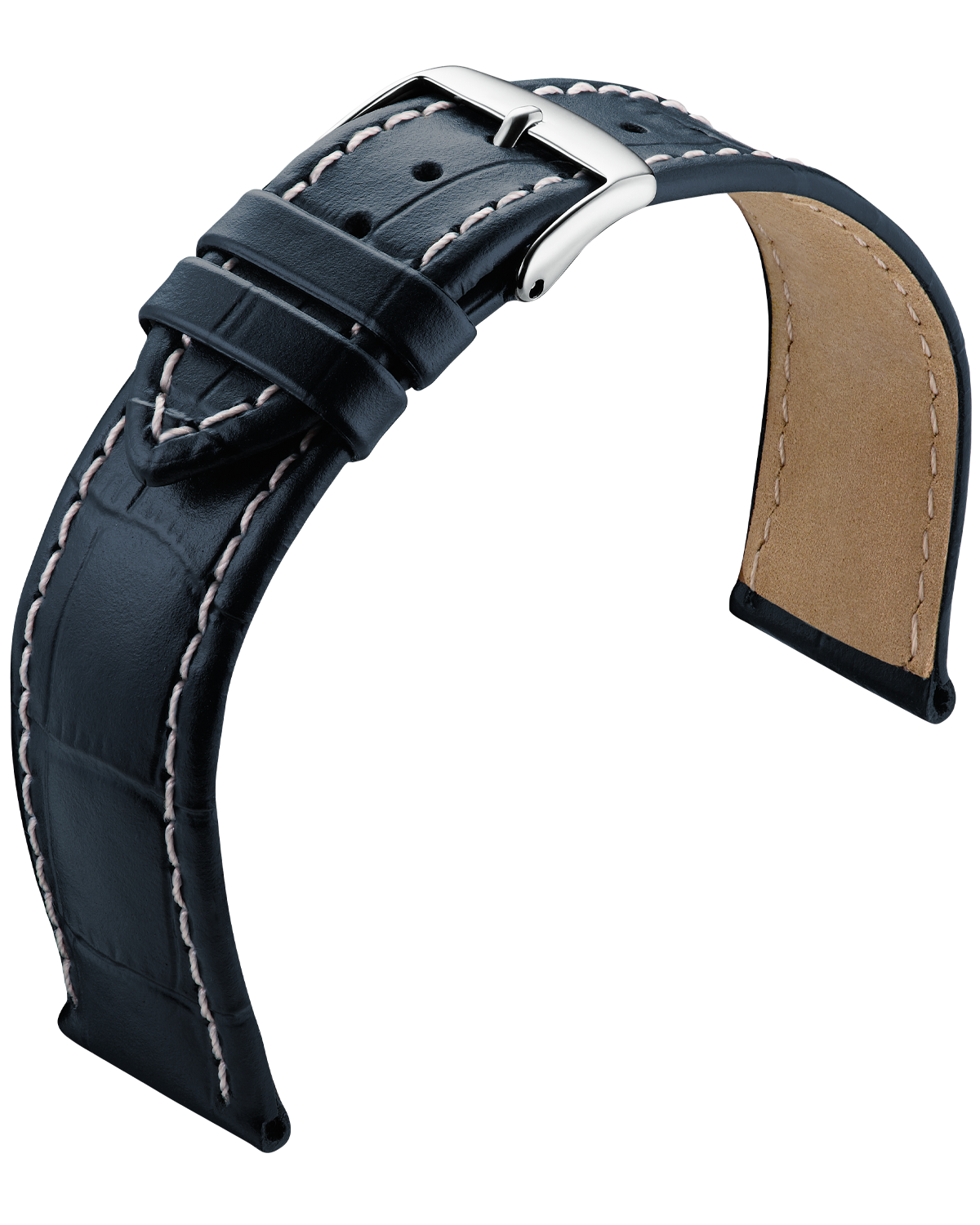 Hochwertiges Kalbleder-Uhrarmband mit Louisiana-Kroko-Prägung und weißer Kontrastnaht.