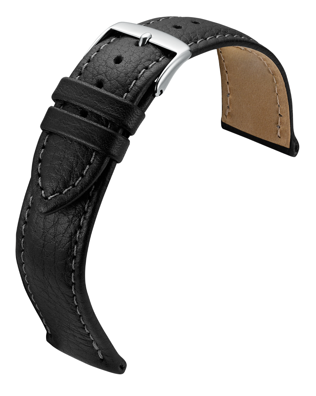Extra weiches Uhrarmband aus genarbtem Rindleder, mit farblich abgesetzter Naht.