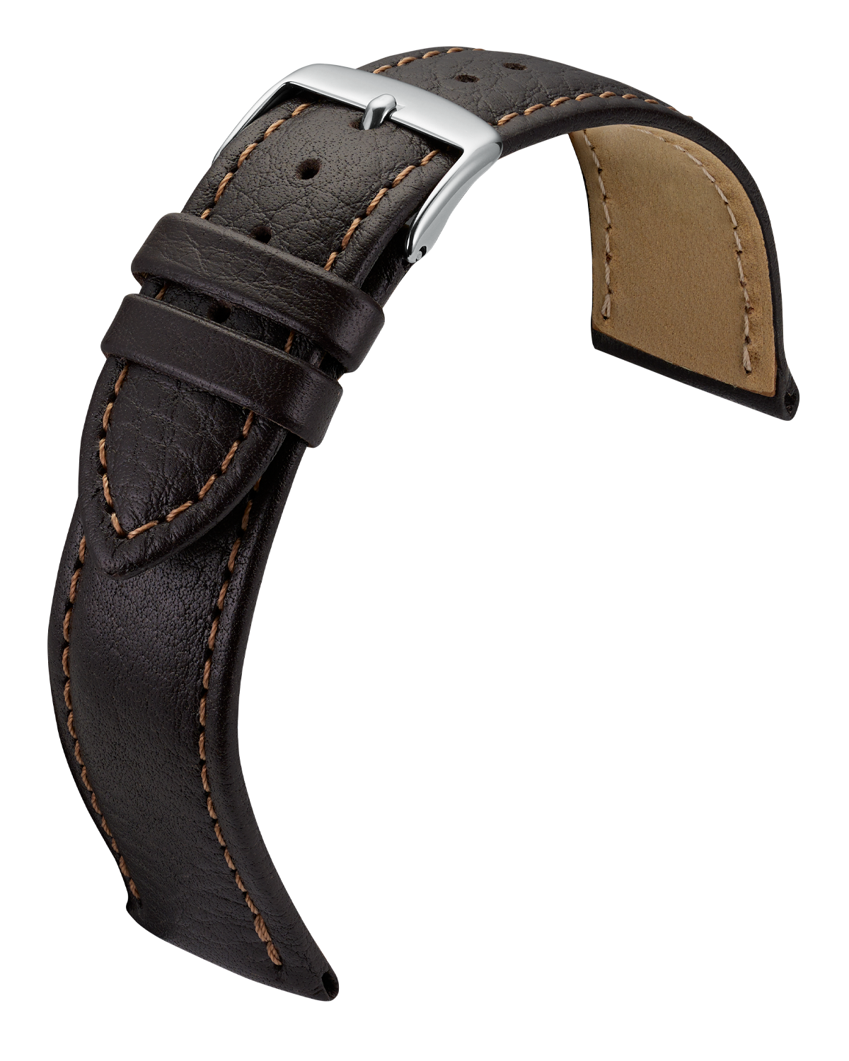 Extra weiches Uhrarmband aus genarbtem Rindleder, mit farblich abgesetzter Naht.