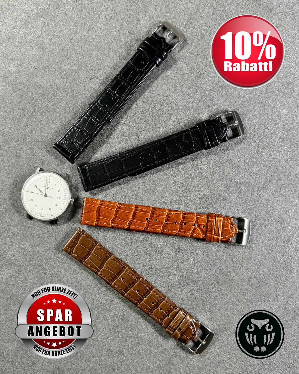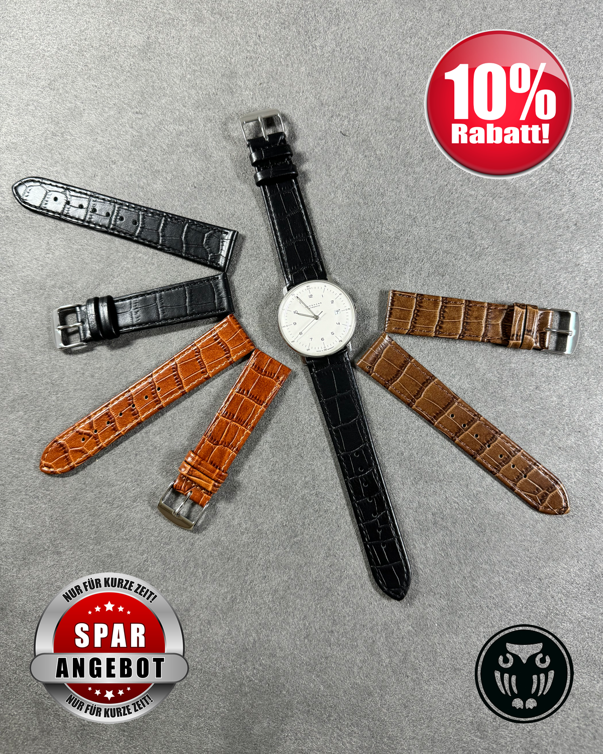 Klassisches Kalbleder-Uhrarmband mit Louisiana-Kroko-Prägung. Ungepolsterte Ausführung, rembordierte Kanten, hautfreundliches Nubuk-Futterleder und Edelstahl-Dornschließe.